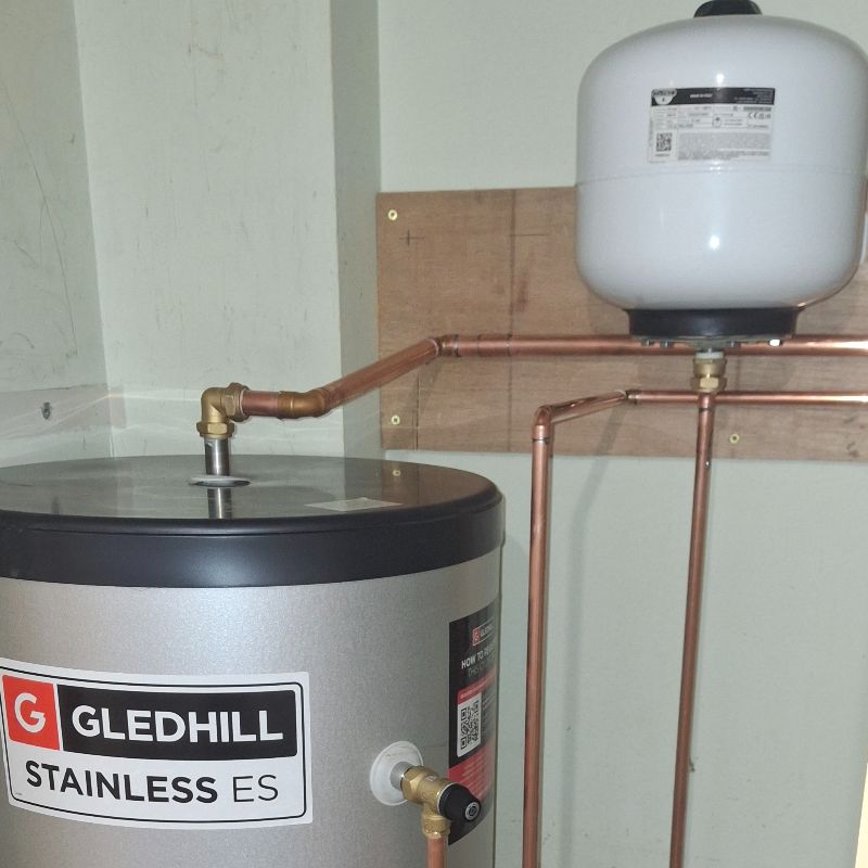 Here is an installation of an unvented hot water cylinder. We install these to provides high-pressure hot water to taps and showers. And you don't need a cold water storage tank.